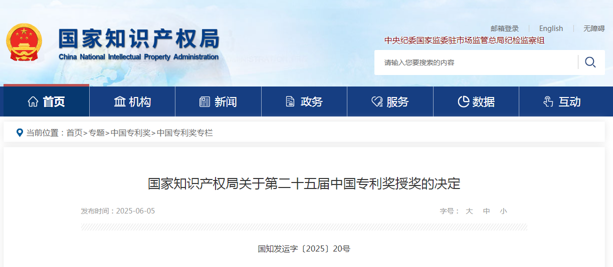 6月5日,国家知识产权局发布关于第二十五届中国专利奖授奖的决定: